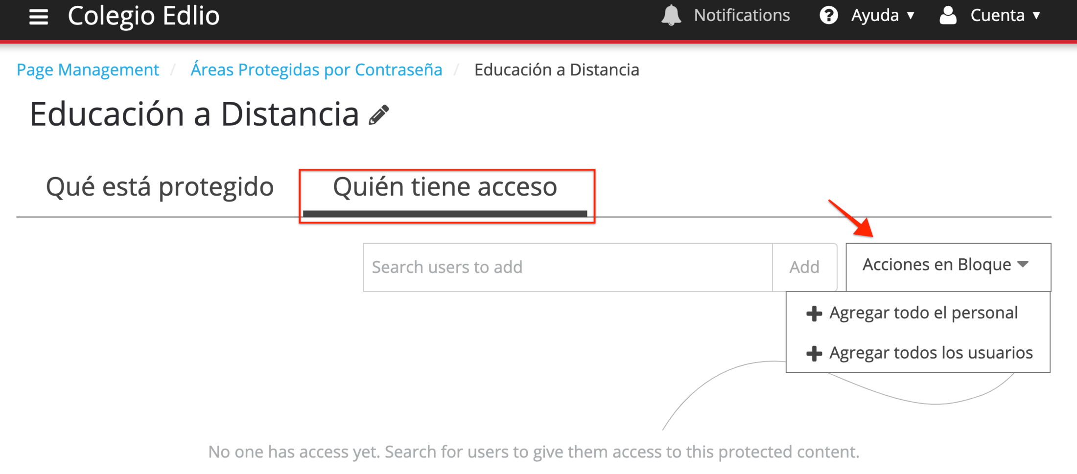 a. Opción 1: De forma masiva, del lado derecho haz clic en "Acciones en Bloque". Puedes agregar a todo el Personal que forma parte del Directorio o agregar a todos los usuarios que hayas dado de alta en Gestión de Usuarios. Una vez agregados, aparecerá la opción de "Remover todos los usuarios".