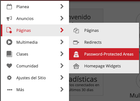 Para accesar a través del menú de hamburguesa que se encuentra a mano superior izquierda. Entra a páginas y luego da clic en "Password-Protected Areas (Áreas Protegidas).