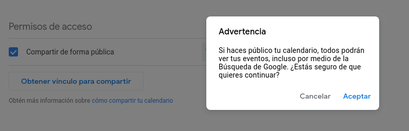 Una leyenda de advertencia aparecerá. Haz clic en botón de Aceptar para confirmar que te quieres hacer público el calendario.