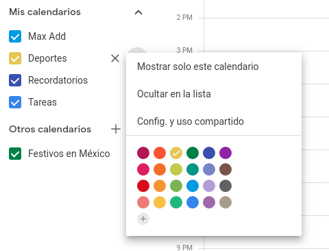2. Del lado izquierdo, acerca el mouse encima del calendario que deseas compartir. Aparecerán tres puntos horizontales, haz clic en ellos y selecciona Config. y uso compartido.